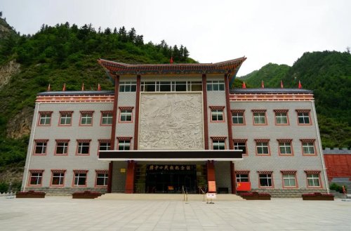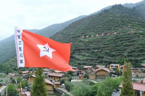 沿著迭部的山路逶迤前行,只見(jiàn)道路兩旁紅旗招展,一個(gè)個(gè)五角星掛在樹(shù)上隨風(fēng)搖曳,紅色的民宅依山而建,墻面上刻畫(huà)著紅軍故事,紅房碧草黛山在藍(lán)天白云的映襯下甚是吸睛,碩大的“紅色臘子口”標(biāo)語(yǔ),無(wú)不提醒著我們,臘子口近了更近了。