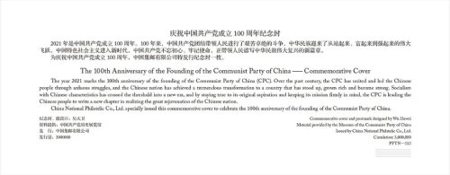 2021年6月29日,《中國(guó)共產(chǎn)黨成立100周年》紀(jì)念郵票和紀(jì)念封在中國(guó)共產(chǎn)黨歷史展覽館隆重發(fā)布。中共中央宣傳部副部長(zhǎng)蔣建國(guó),國(guó)家郵政局黨組書記、局長(zhǎng)馬軍勝,中國(guó)郵政集團(tuán)有限公司黨組書記、董事長(zhǎng)劉愛力出席發(fā)布儀式并為《中國(guó)共產(chǎn)黨成立100周年》紀(jì)念郵票揭幕,國(guó)家郵政局黨組成員、副局長(zhǎng)戴應(yīng)軍,中國(guó)共產(chǎn)黨歷史展覽館館長(zhǎng)吳向東,中國(guó)郵政集團(tuán)有限公司黨組成員、副總經(jīng)理康寧為《慶祝中國(guó)共產(chǎn)黨成立100周年》紀(jì)念封揭幕。中國(guó)郵政集團(tuán)有限公司黨組成員、副總經(jīng)理王儉主持。
