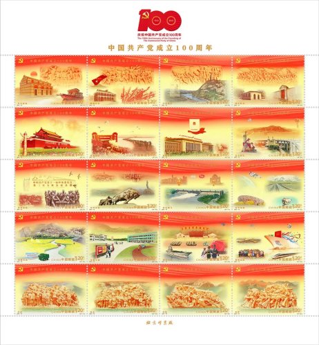 按照中國(guó)共產(chǎn)黨成立100周年慶祝活動(dòng)安排,經(jīng)報(bào)請(qǐng)黨中央批準(zhǔn),中國(guó)郵政將于2021年7月1日發(fā)行《中國(guó)共產(chǎn)黨成立100周年》紀(jì)念郵票1套20枚,紀(jì)念封1套1枚。此次活動(dòng)發(fā)布了紀(jì)念郵票的詳細(xì)信息,內(nèi)容分別為:1.開天辟地;2.崢嶸歲月;3.中流砥柱;4.偉大勝利;5.開國(guó)大典;6.抗美援朝;7.制度奠基;8.自力更生;9.改革春潮;10.對(duì)外開放;11.世紀(jì)騰飛;12.科學(xué)發(fā)展;13.擺脫貧困;14.全面小康;15.強(qiáng)軍興軍;16.揚(yáng)帆遠(yuǎn)航;17.信仰;18.偉業(yè);19.攻堅(jiān);20.追夢(mèng)。郵票采用連票設(shè)計(jì)形式,以紅色、金色為畫面主基調(diào),運(yùn)用油畫寫實(shí)手法表現(xiàn),并采用連綿不斷的飄帶貫穿整體,寓意中國(guó)共產(chǎn)黨百年奮斗的光輝歷程。該套郵票特別使用兩色紅熒光油墨,在紫光燈下,慶祝建黨百年標(biāo)識(shí)、“一大會(huì)址”、“天安門”等郵票主體元素閃放璀璨的光芒。