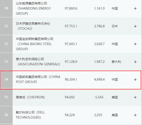 8月2日,2021年《財富》世界500強排行榜單新鮮出爐,中國郵政集團有限公司排名第74位,首次挺進世界前80強;在上榜的世界6家郵政企業中排第2位,其中年營業收入排世界郵政第2位,利潤排世界郵政第1位。