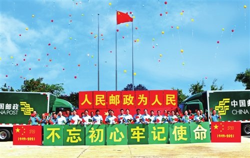 圖為江蘇省徐州市郵政分公司員工在歡度國慶、喜迎世界郵政日之際表達郵政人“不忘初心、牢記使命”“人民郵政為人民”的共同心聲。