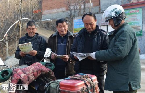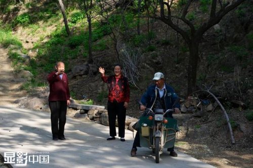 董乃軍負(fù)責(zé)200多個(gè)投遞點(diǎn),他每天需要帶著近百十斤重的郵包,翻越十幾座山頭為村民投遞,38年的時(shí)間已經(jīng)丈量了一百多萬(wàn)公里的山路,騎壞了十幾輛自行車(chē),但從沒(méi)有因?yàn)樘鞖庠蚧蜃约旱氖韬鲂傅《⒄`任何郵件的投遞,實(shí)現(xiàn)了38年無(wú)差錯(cuò)。圖為董乃軍從村里離開(kāi)時(shí),老人們和他揮手告別。