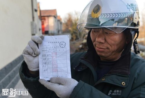 在他的這條郵路上,有5個(gè)郵政排單的蓋章點(diǎn),他每天都會(huì)認(rèn)認(rèn)真真的蓋完。圖為董乃軍在張家洞村展示已經(jīng)蓋完印章的排單。