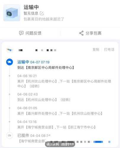 周爸爸查詢了信息,今天上午7點,郵件已經到達南京郵區(qū)中心局郵件處理中心,預計今天就能送達目的地。