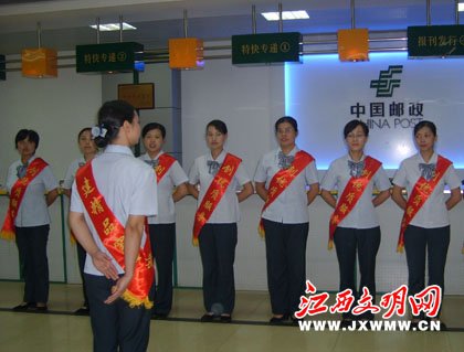 每天清晨、當(dāng)您迎著朝霞、走過吉安市郵政局鷺洲營業(yè)廳門口的時候,可以看到十幾名營業(yè)員排著整齊的隊伍,莊嚴(yán)宣誓。這,只是吉安市郵政局“建精品窗口、創(chuàng)優(yōu)質(zhì)服務(wù)”的一個小縮影。