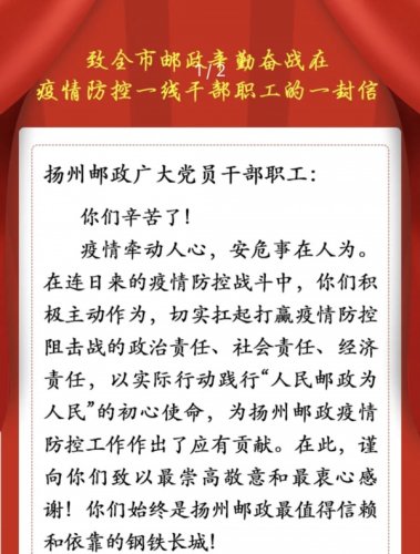 “今年以來,揚州公司克服各種不利影響,改革創(chuàng)新取得了明顯成效。面對當(dāng)前揚州嚴(yán)峻復(fù)雜的疫情防控形勢,你們一手抓防疫一手抓發(fā)展,取得了很好的效果,希望你們繼續(xù)按照地方政府要求,全力做好疫情防控各項工作。堅持人民至上、生命至上,把困難估計得更充分,把形勢考慮得更嚴(yán)峻,齊心協(xié)力、攻堅克難,在保證疫情防控要求的前提下,努力彰顯中國郵政的責(zé)任擔(dān)當(dāng),堅決打贏疫情防控和經(jīng)營發(fā)展的‘雙勝利’!請向廣大揚州郵政員工轉(zhuǎn)達省分公司黨委的誠摯問候!”