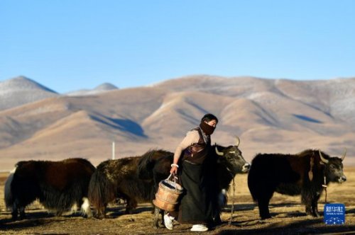 青海省玉樹藏族自治州稱多縣珍秦鎮二村牧民扎西德藏準備給牦牛擠奶(2020年10月28日攝)。新華社記者 張龍 攝