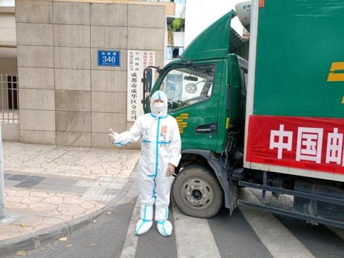 成都市郵政分公司相關(guān)負(fù)責(zé)人介紹,為了保證運(yùn)輸生活物資能快速、新鮮、安全地到達(dá)管控區(qū)的居民手里,“郵遞小哥”每天穿著防護(hù)服至少14個(gè)小時(shí),常常忙到深夜,第二天又奔赴在抗疫一線。