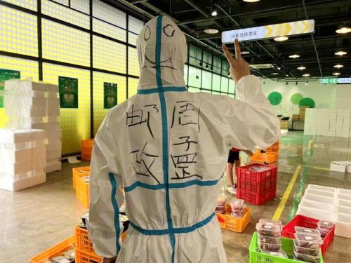 “當(dāng)裝滿郵車的蔬菜進(jìn)入社區(qū)時(shí),我遠(yuǎn)遠(yuǎn)就看著龍彪,厚厚的防護(hù)服穿在身上只剩下兩只瞪得大大的眼睛。”他的同事唐浩心疼道,他一開就是幾小時(shí),到了管控區(qū)常常連一個(gè)面館都找不到,就在車上隨便吃點(diǎn)又繼續(xù)下一站。