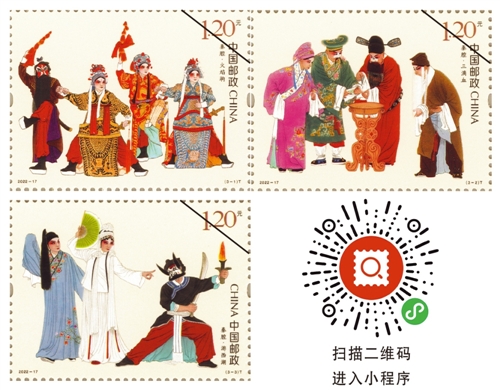 該套郵票全套3枚,郵票圖案名稱分別為“火焰駒”“三滴血”“游西湖”。郵票選取了《火焰駒》《三滴血》《游西湖》3部秦腔經典傳統(tǒng)劇目的精彩片段,分別表現(xiàn)了銅錘花臉、文武小生、丑角、老生、小生、小旦等典型戲曲人物形象,原畫為絹本設色,采用中國傳統(tǒng)工筆畫法,運用粗獷的線條、濃烈的色彩,以呼應秦腔獨特的藝術風格,同時結合淡雅的背景,烘托前景重彩戲曲人物,增添了畫面的古風雅韻。