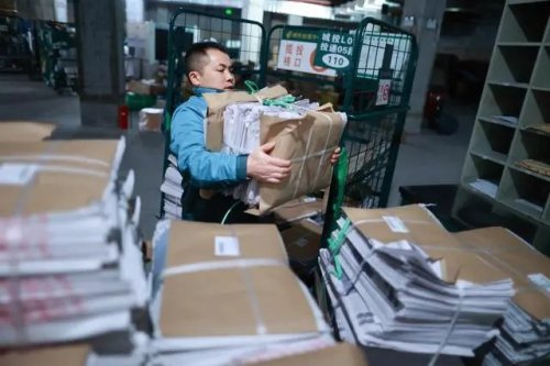 莫富元在貴州省龍里縣草原路郵政郵件處理中心分揀當天的報紙(2月14日攝)。