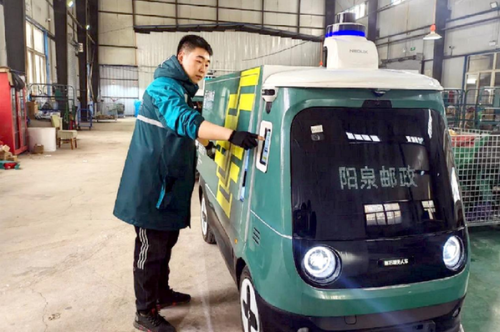 4月11日,在陽泉郵政開發區營業部分揀中心,郵政員工將快遞包裹裝進無人物流配送車車廂內。輕點顯示屏操作后,無人物流配送車按照系統預設線路自動上路行駛,并將郵件投送到指定快遞自提點。