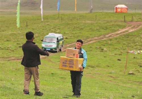 看到郵車來(lái)了,牧民迫不及待地迎上去接過(guò)自己網(wǎng)購(gòu)的商品?!酢豆と巳?qǐng)?bào)》記者 王偉偉 攝