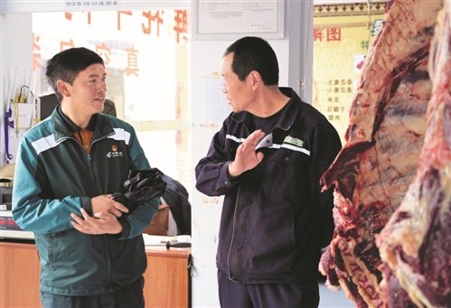 哈弄奪機(jī)向牦牛肉商戶了解最新的市場(chǎng)行情?!跣氯A社記者 李賀 攝