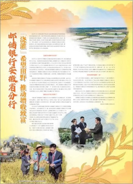 郵儲(chǔ)銀行安徽省分行將繼續(xù)立足安徽省情農(nóng)情,圍繞現(xiàn)代農(nóng)業(yè)發(fā)展新特點(diǎn)新要求,主動(dòng)切入重要項(xiàng)目和重大工程,創(chuàng)新金融產(chǎn)品和服務(wù)模式,為“農(nóng)業(yè)有干頭、農(nóng)村有看頭、農(nóng)民有奔頭”的壯美畫卷添上濃墨重彩的一筆。(數(shù)據(jù)來源:郵儲(chǔ)銀行安徽省分行)
