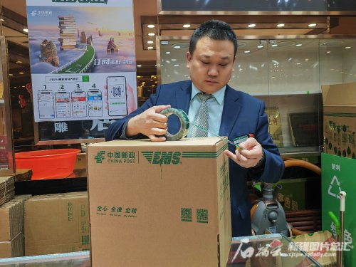中國(guó)郵政集團(tuán)有限公司烏魯木齊市分公司揚(yáng)子江路營(yíng)業(yè)網(wǎng)點(diǎn)工作人員使用可循環(huán)快遞箱打包快遞。朱蕊秀 攝