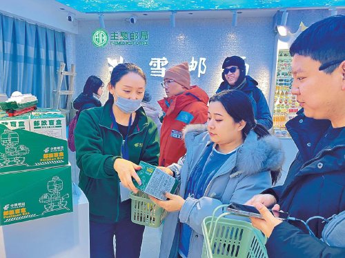 圖為游客在冰雪大世界主題郵局選購文創產品。