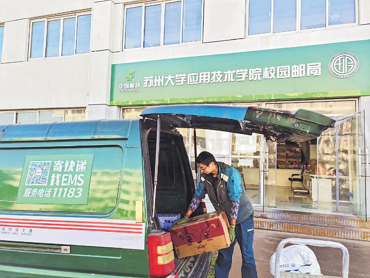 郵政工作人員將蘇州大學(xué)應(yīng)用技術(shù)學(xué)院校園郵局的出口郵件搬運(yùn)裝車。