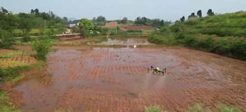 植保無(wú)人機(jī)撒下秧田除草劑。郵儲(chǔ)銀行重慶分行供圖