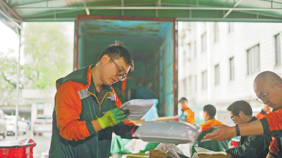 攬收郵件時,阮海良常與“郵掌柜”交流業務。
