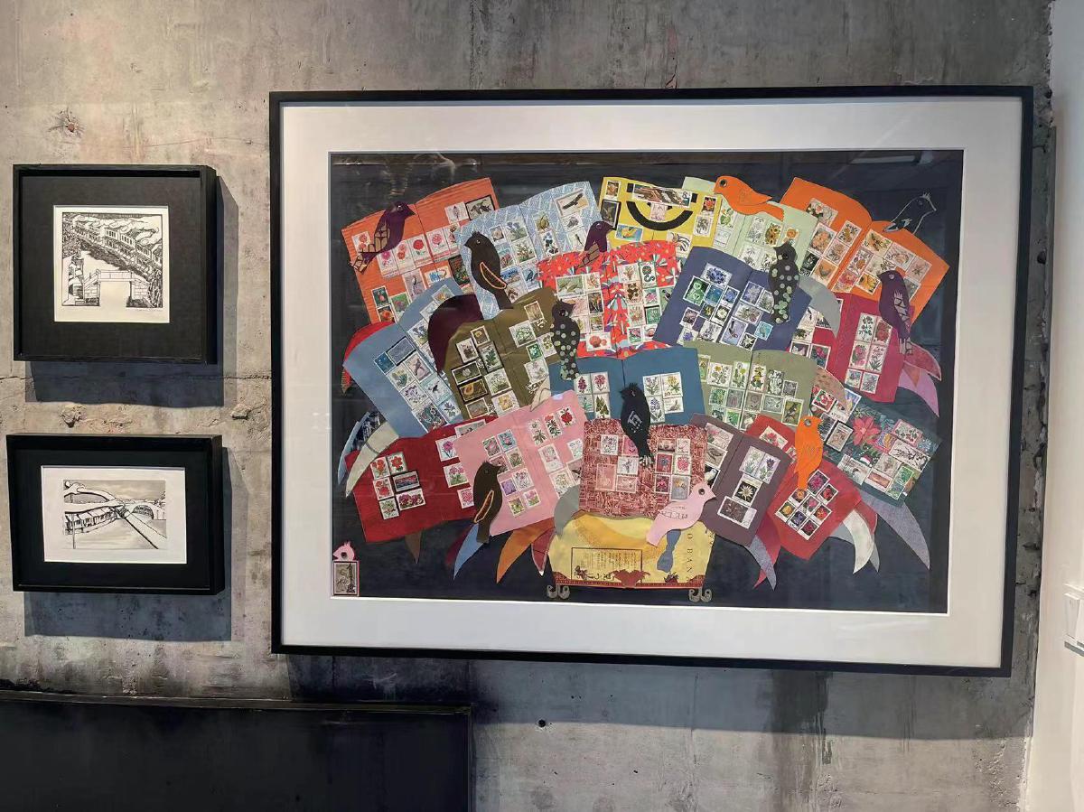 《繁花》郵折的大小與外觀,與小說的書封如出一轍。封面圖案飾以書中“春香家的婚房”,南面開門臨路的居住樣式,在過去的上海極有代表性;打開郵折,中央的《繁花》同名彩色插畫首先映入眼簾,接著一幅幅插畫又把小說情節回憶了一遍,吵吵鬧鬧的小人物——阿寶、陶陶、蓓蒂、汪小姐、李李,20世紀六七十年代的經典場景——國泰電影院、小毛家、碼頭貓、曹楊工人新村、上海中心城區簡圖等一股腦兒涌現出來;郵票底部的背景圖選用了金宇澄為小說《繁花》創作的首張插畫《屋頂》——20世紀60年代的思南路,阿寶和蓓蒂并肩坐在屋頂,“瓦片溫熱,黃浦江船鳴”。和小說一樣,金宇澄的畫作里充滿細節和敘事,透過精美的插畫郵折,能窺見《繁花》的煙火人間,對書中的萬事萬物展開想象,編織出“不響”背后的意蘊。