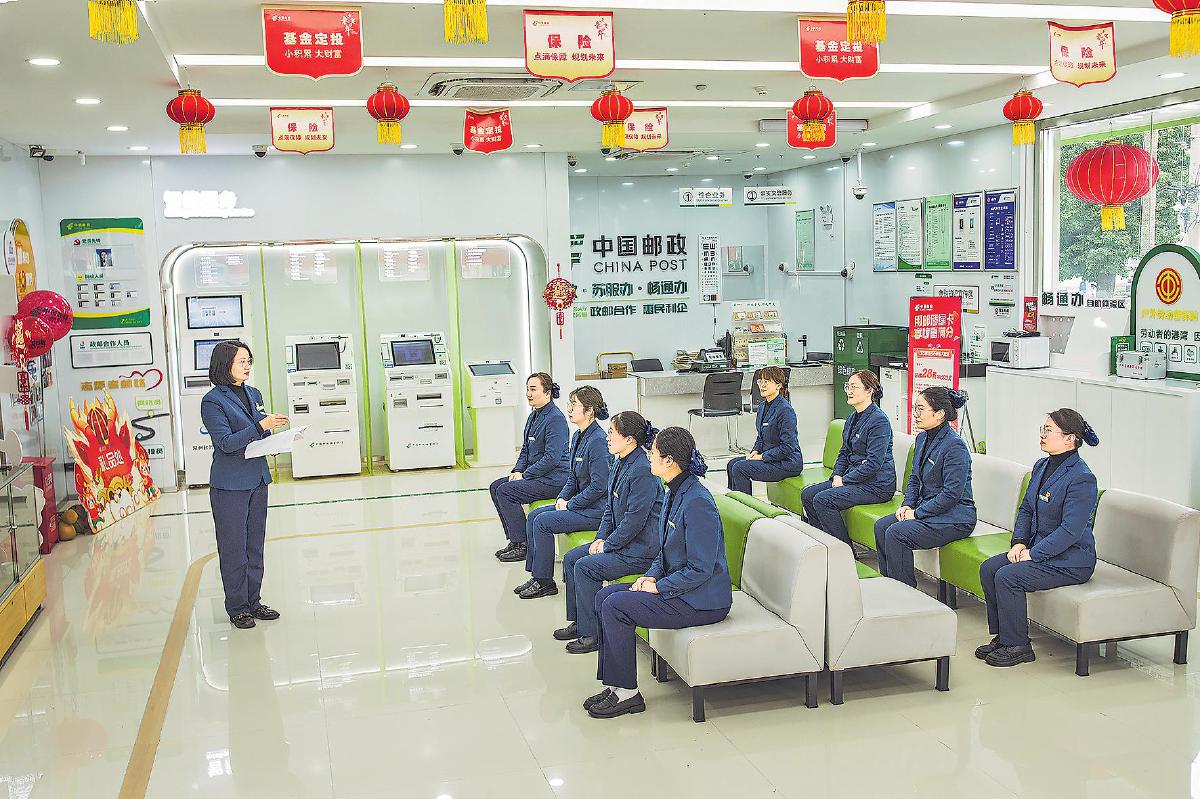 江蘇常州花園支局局長張小飛通過晨會鼓舞員工士氣、明確當日工作任務。 □吳敏 攝