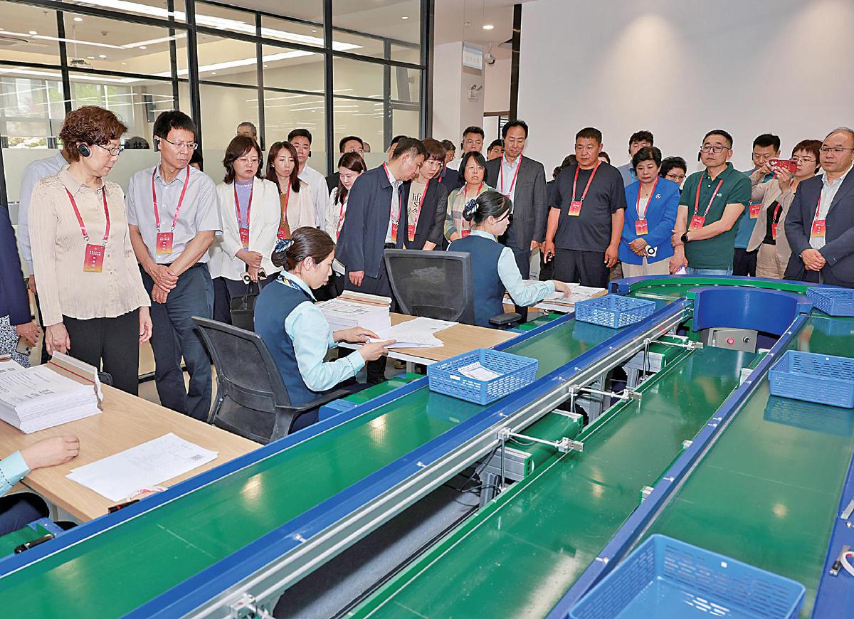 5月13日上午,來自北京、天津、河北、江蘇、山東5個省(市)的部分全國人大代表來到“江蘇法郵集約化服務中心”,先后視察法院集中送達中心、集中編目中心、12368訴訟服務熱線中心等工作區(qū)域,詳細了解了運營模式、服務流程、創(chuàng)新成效等。