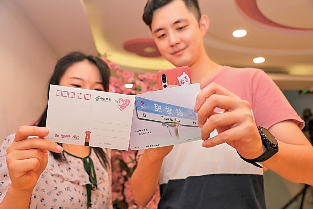 5月20日一大早,位于上海最“甜”的馬路——甜愛路上的甜愛婚姻登記中心已經聚集了不少新人。他們或手牽手,或相依偎,臉上洋溢著幸福的笑容。現場正在舉辦的是由上海愛情郵局和甜愛婚姻登記中心共同發起的“520”主題活動。婚姻登記中心內的郵政展位前,新人們興奮地排隊等待著,他們有的在“愛情明信片”上寫下愛情寄語,有的將婚紗照定制成精美的愛情郵折或愛情儲值卡。最讓人期待的環節莫過于將寫有甜蜜話語的明信片投入粉色的“愛情郵筒”,讓愛的儀式感瞬間拉滿。