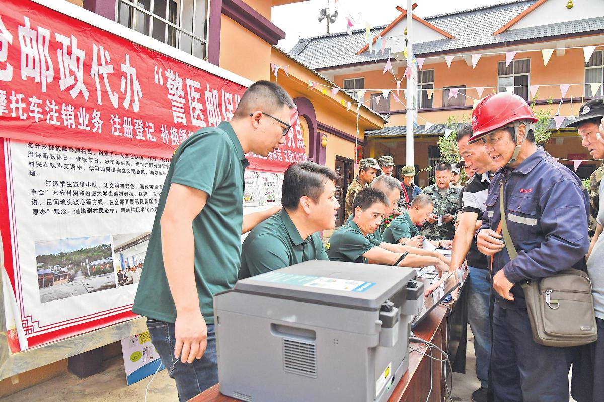 2023年7月,瀾滄縣分公司與縣公安局交通警察大隊聯合啟動“警醫郵保”項目服務并將其下沉至邊境村寨,開展流動服務,既方便村民在“家門口”辦理業務,又通過線下宣傳提升村民交通安全意識,減少交通事故發生。廣場一角,鮮紅醒目的“警醫郵保臨時服務點”橫幅拉起,兩張長桌合并擺放整齊,郵政工作人員一字排開、分工操作,熱情地接待每一位村民。一個熟悉的身影出現在人群中,李永梅打著電話,在村口與廣場之間忙前跑后。