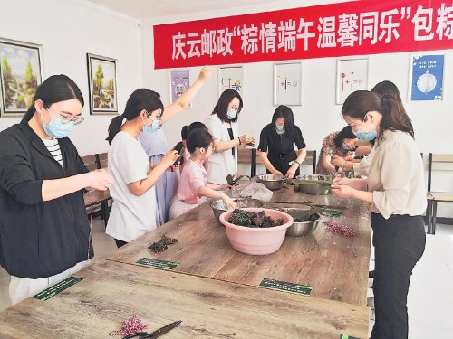 每年端午,德州市慶云縣郵政分公司都會(huì)邀請(qǐng)客戶到“職工小家”開(kāi)展包粽子活動(dòng)。 □李平 攝