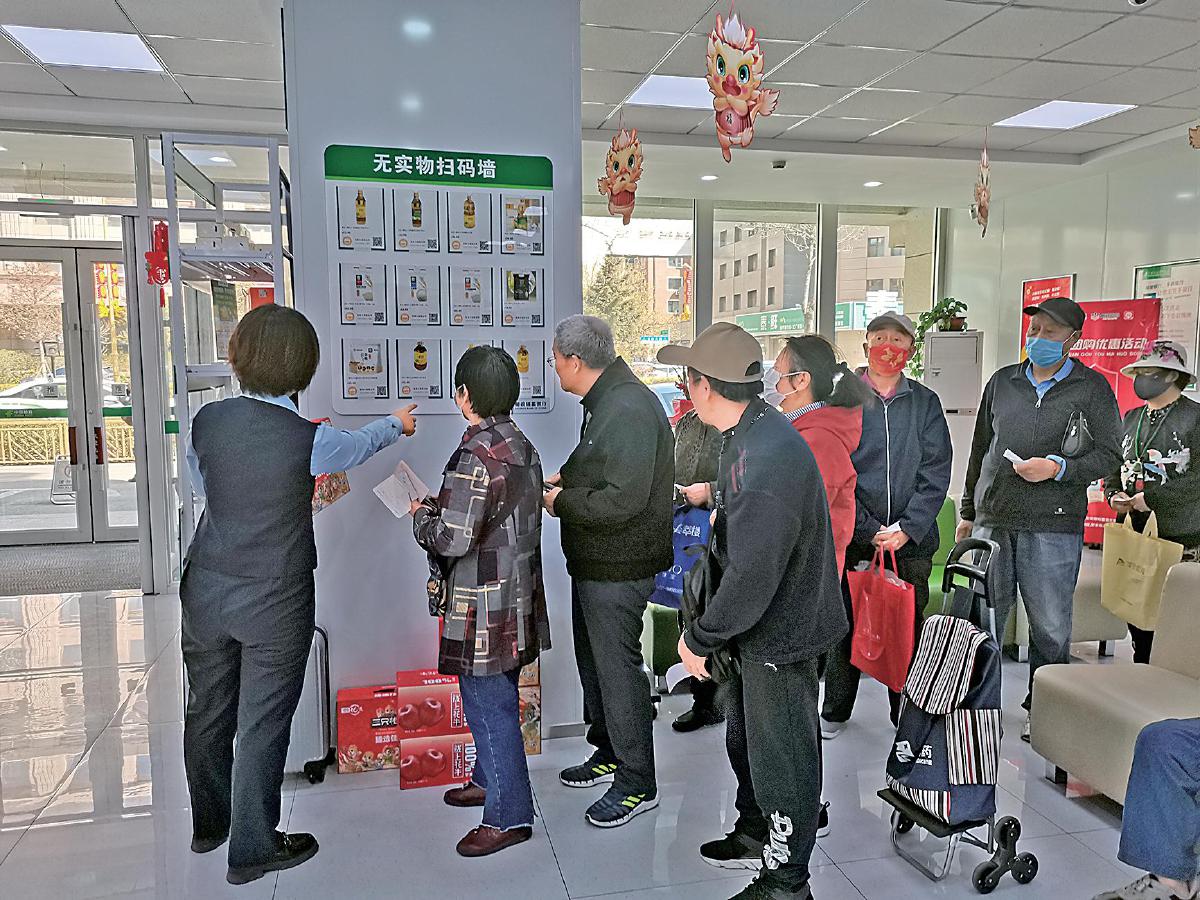 長春郵政在營業(yè)廳設(shè)置無實物掃碼墻,方便會員在線選購商品。□吳巖 攝