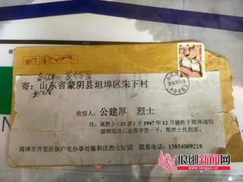 那是2016年6月13日,王德建在對(duì)照清單進(jìn)行勾挑核對(duì)信件時(shí),發(fā)現(xiàn)了一封特別的信件。信封上印著“尋找烈士”四個(gè)鮮紅大字,寄信人是一位幫助烈士尋親的志愿者——菏澤市經(jīng)濟(jì)開發(fā)區(qū)佃戶屯街道辦事處張和莊社區(qū)黨支部書記張景憲,收件地址是“蒙陰縣坦埠區(qū)朱下村”,收件人是“公建厚烈士”,下邊還標(biāo)注著一行小字:該烈士(29歲)于1947年12月犧牲于菏澤戰(zhàn)役,望郵遞員同志再辛苦一下,幫烈士找到家。