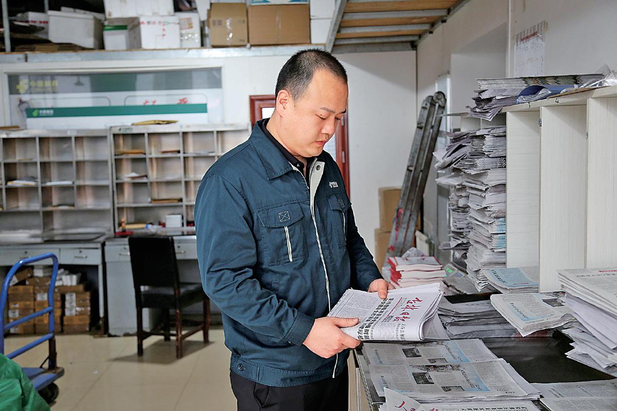 王超順出班前整理報刊、郵件。