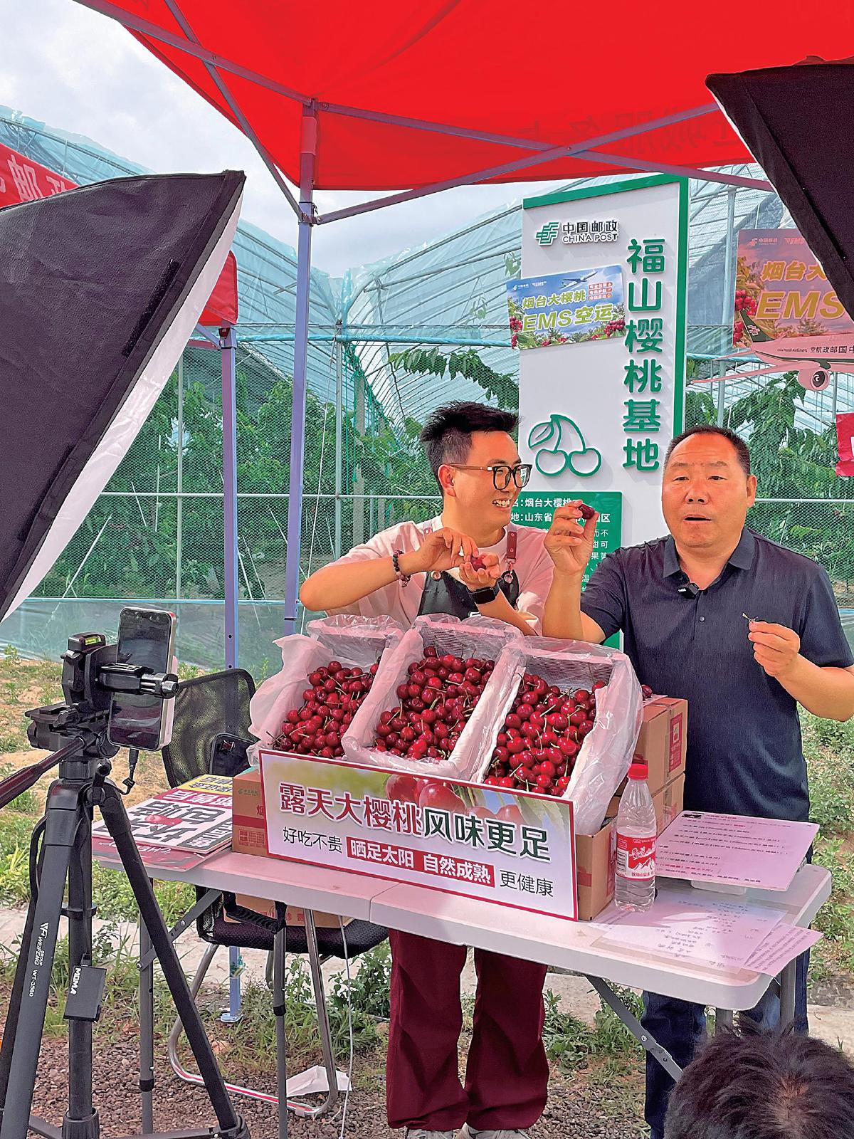 郵政員工與當(dāng)?shù)睾献魃缲撠?zé)人在大櫻桃基地進行現(xiàn)場直播?! 趵铞I 攝