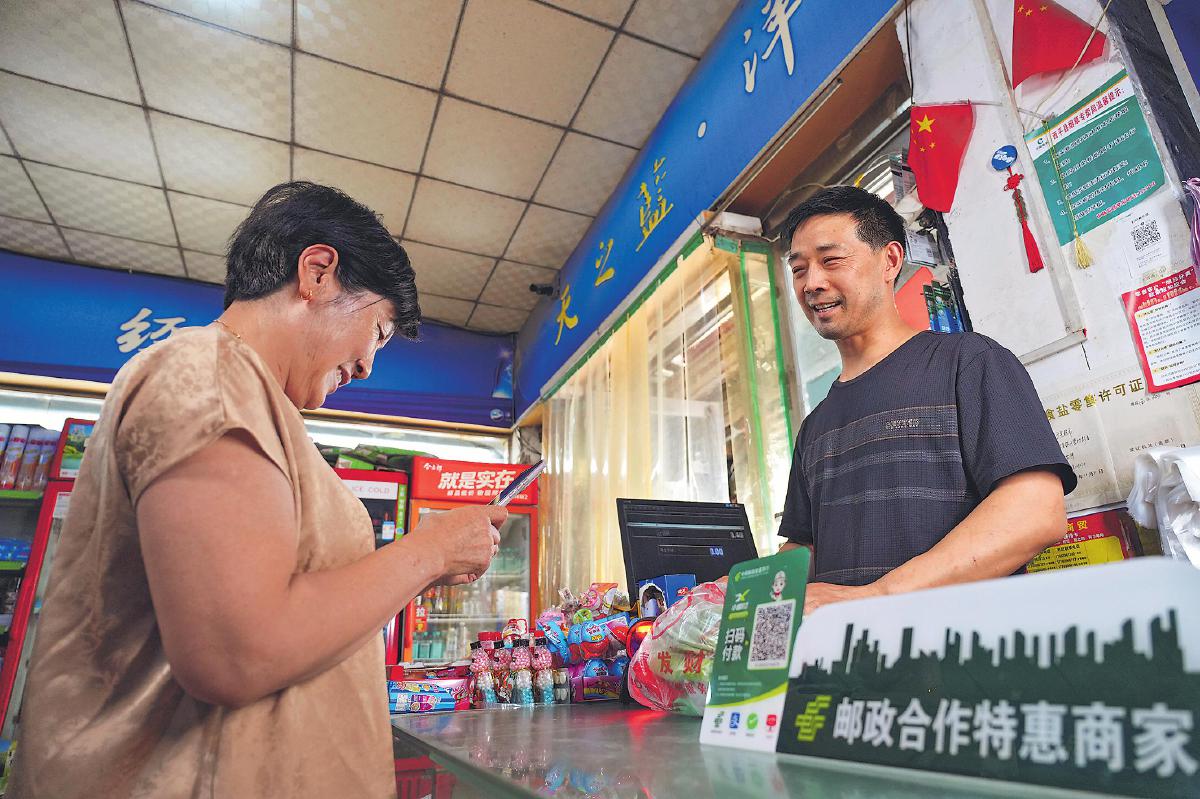 村民在西平縣盆堯鎮于營村綜合便民服務站使用“小郵付”掃碼付款。