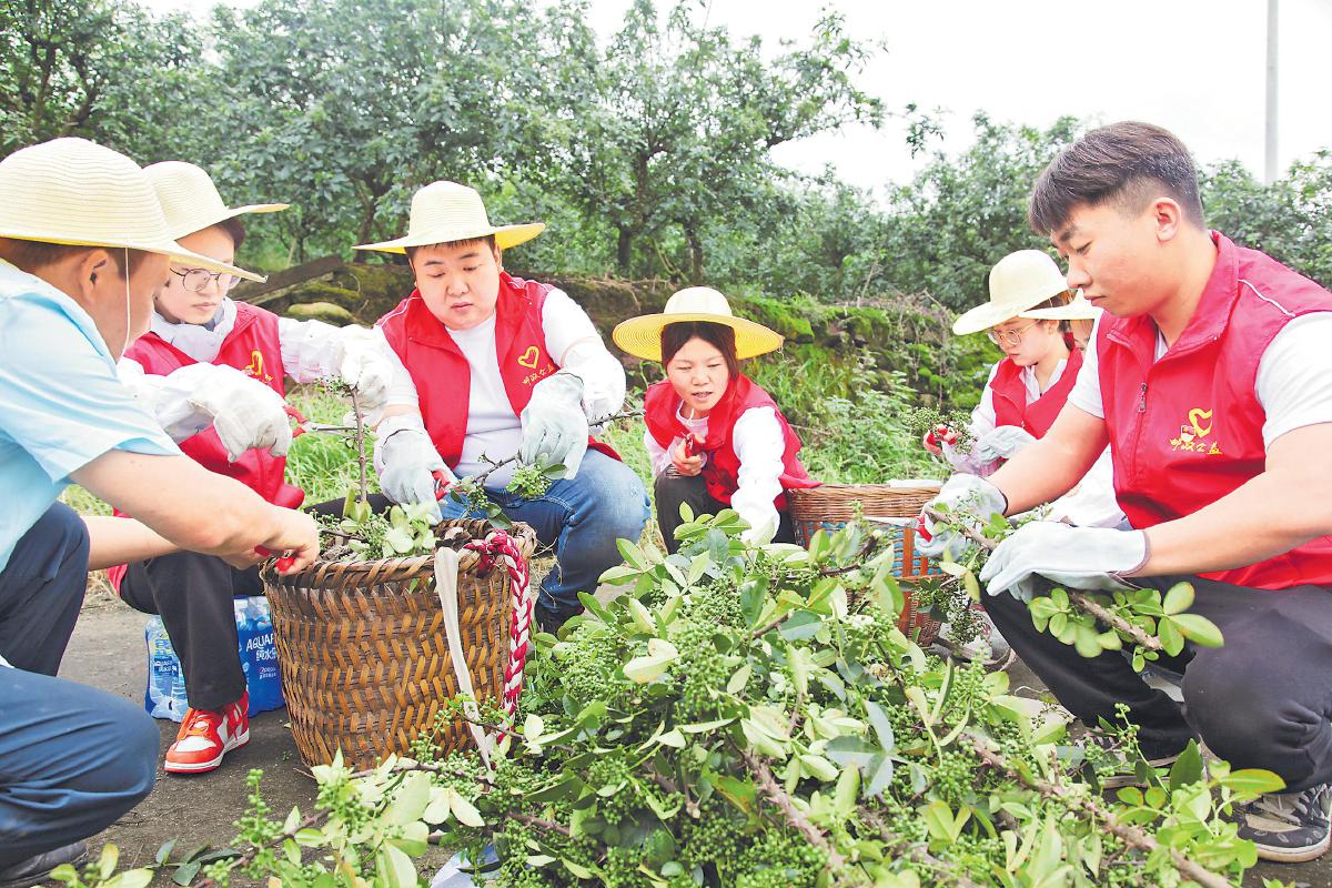 近日,重慶市江津區青花椒豐收了。江津區國際花椒產業城臨時開市運營。在距市場不足1公里的先鋒鎮雙寶村椒農袁必蘭家的花椒地里,江津區郵政分公司一群青年員工身著紅色志愿馬甲,忙著提籃采摘花椒。花椒綠與志愿紅的交織,共同繪就了一幅美好的豐收畫卷。袁必蘭對前來幫忙的郵政青年連聲道謝。