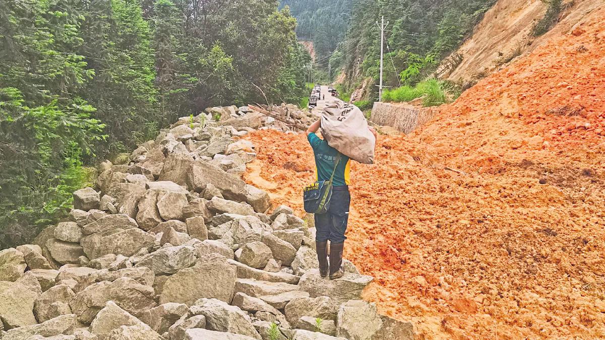 廣西壯族自治區(qū)柳州市融水苗族自治縣因洪水突發(fā)山體滑坡,融水縣郵政分公司工作人員徒步走過滑坡區(qū),為黨鳩村村民投遞包裹。□黃建勛 攝