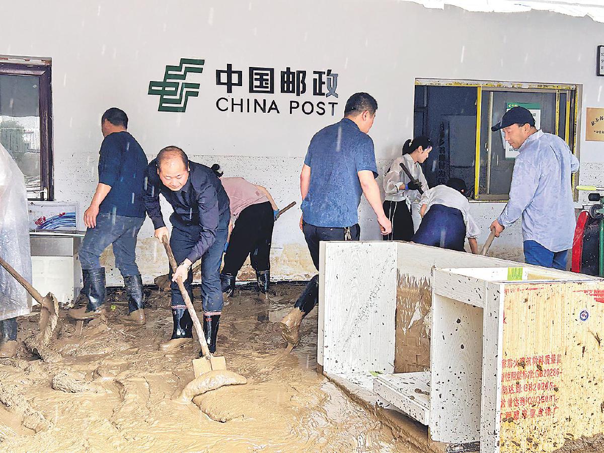 6月26日,安徽省黃山市歙縣郵政分公司第一時間組織12人的先鋒隊趕往紹濂郵政所除淤、清理雜物,開展災后恢復生產經營工作。 □王艷琪 攝