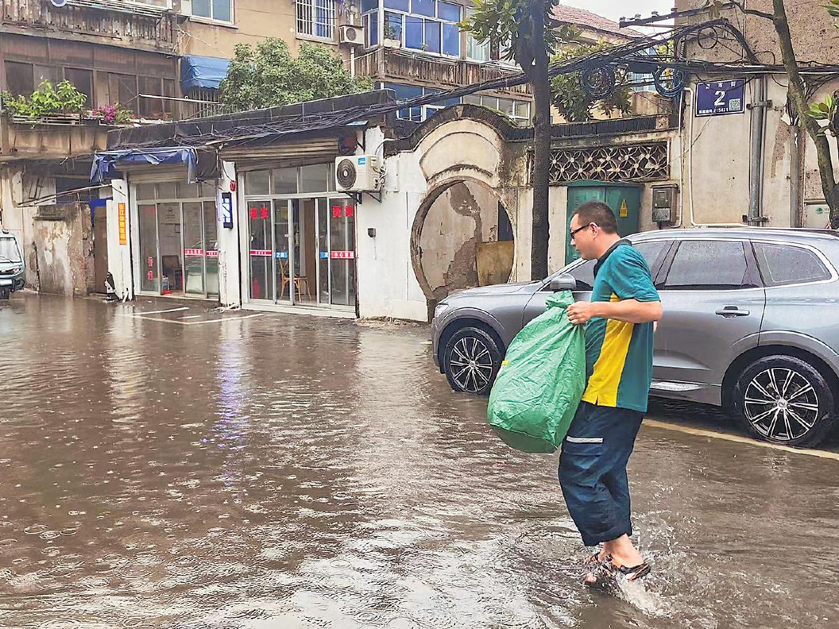 江蘇省蘇州市太倉縣郵政分公司投遞員冒雨蹚水投遞郵件?! 跣煊裢ぁz