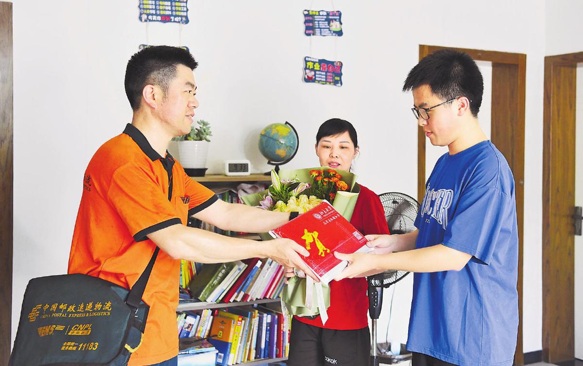 7月21日上午,浙江省永嘉縣郵政分公司員工王小蒙為兒子王傳祈送上北京大學錄取通知書。收到父親送來的錄取通知書,王傳祈很激動,感謝父親以辛勤的工作為自己樹立了榜樣,表示上大學后要繼續努力學習,以優異的成績回報父母。王小蒙參加郵政工作已有16年,送了很多件高考錄取通知書,這是他最幸福、最特殊的一次投遞。他希望兒子今后用所學的知識為國家貢獻自己的一份力量。