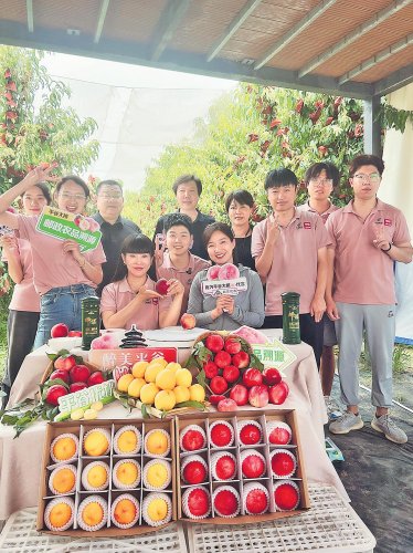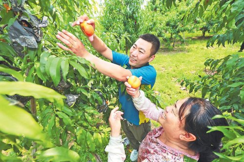 郵政員工與桃農一起采摘鮮桃,共享豐收的喜悅。□萬宇 攝