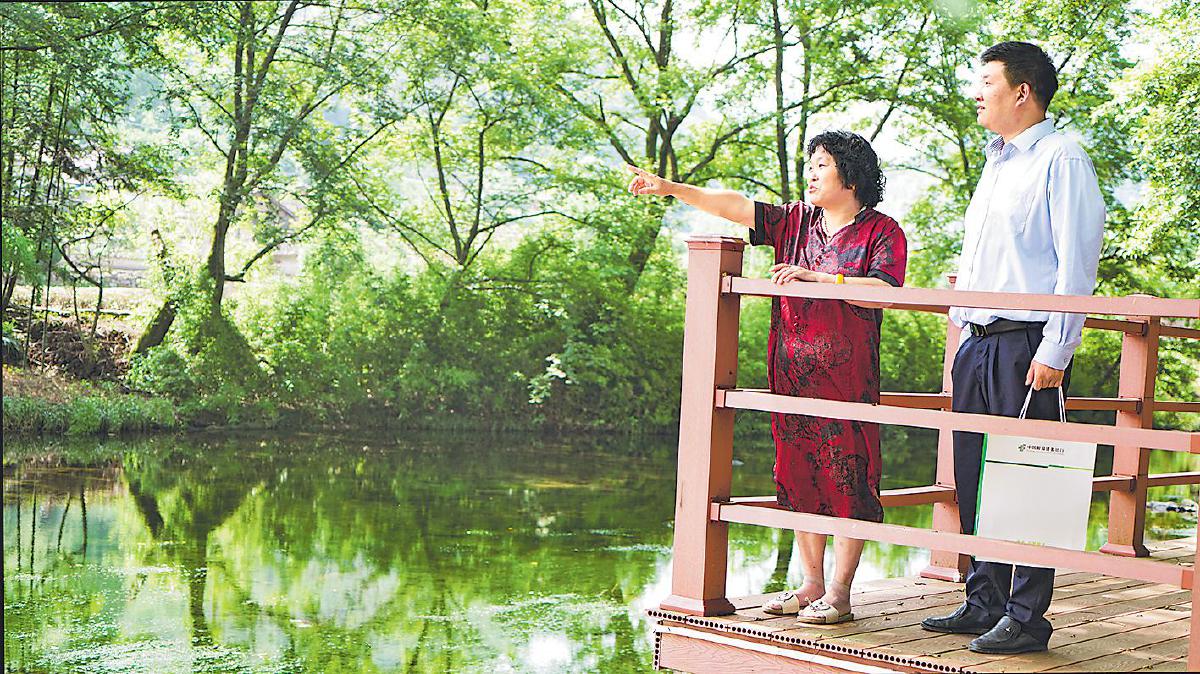 客戶經理與查金花(左)在水墨汀溪邊交談。 □郎俊 攝