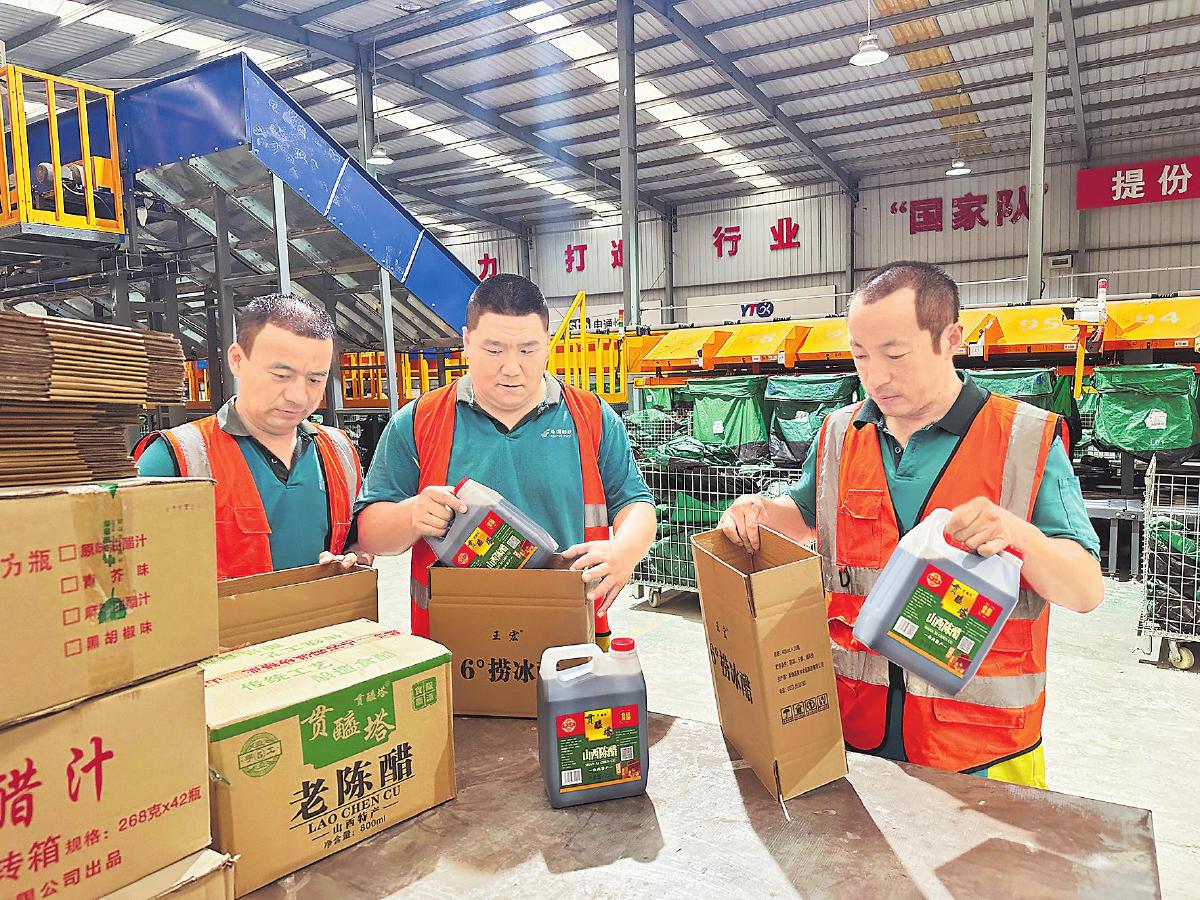 在寄遞物流共配中心內(nèi),郵政員工正在打包陳醋郵件。