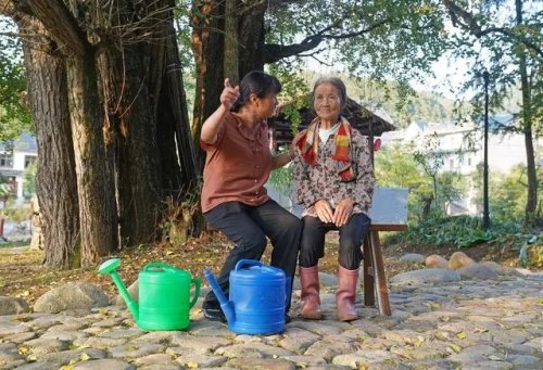 這是在江西省鉛山縣陳坊鄉(xiāng)沽溪村,羅細(xì)英(左)與一位相識的老人聊天(9月28日攝)。新華社記者 萬象 攝
