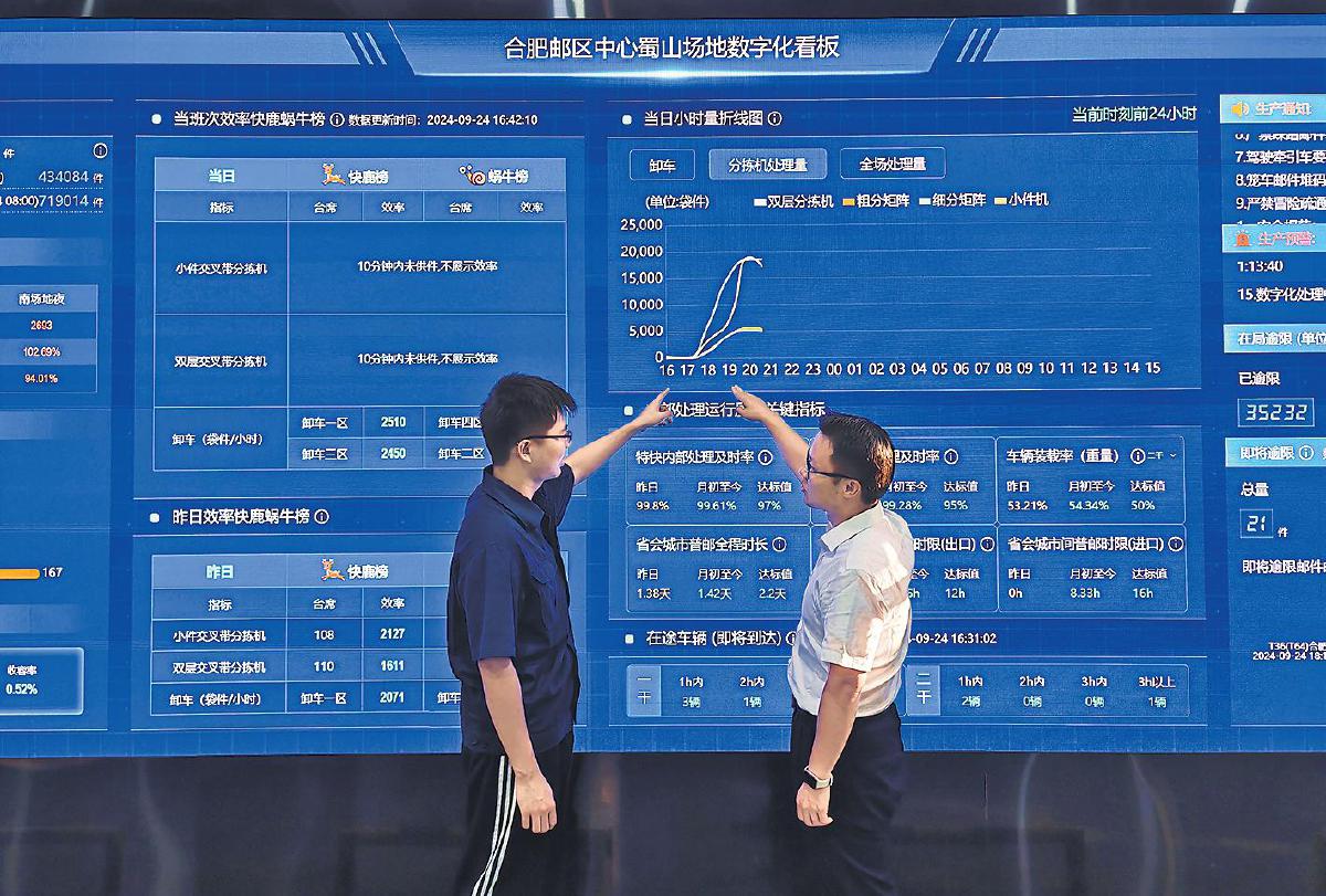 在車(chē)間內(nèi)的數(shù)字化看板上,“即將逾限郵件郵路TOP5”下不斷滾動(dòng)和更新數(shù)字,實(shí)時(shí)展示未來(lái)1小時(shí)即將逾限郵件數(shù)據(jù),并用顏色區(qū)分緊急等級(jí)。現(xiàn)場(chǎng)監(jiān)管人員則根據(jù)郵件掃描點(diǎn)信息判斷郵件所處環(huán)節(jié),及時(shí)干預(yù),避免成為已逾限郵件。這是采訪組在蜀山場(chǎng)地所見(jiàn)記憶深刻的一幕。