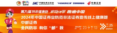 為進一步加大防范非法證券活動正面宣傳力度,更加有效地保護投資者合法權益,倡導全民健康生活方式,履行證券行業社會責任,在中國證券業協會、中國田徑協會、中國證監會陜西監管局、中共陜西省委金融委員會辦公室、陜西證券期貨業協會等多家單位的指導下,中郵證券于2024年9月23日正式啟動“2024年中國證券業防范非法證券宣傳線上健康跑”第二十五站公益活動,歷時21天,于10月13日圓滿收官。