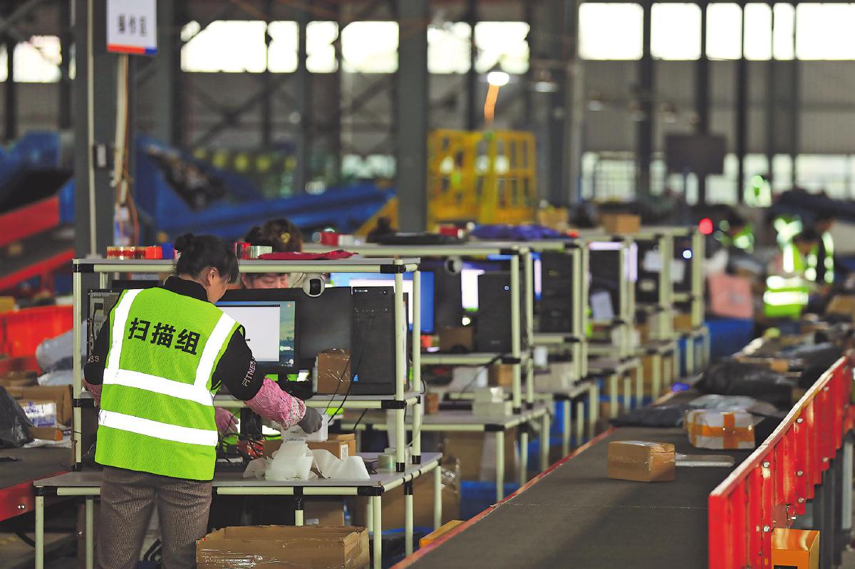 工作人員將入庫后的郵件逐件掃描換單,一件件貼上郵政面單的包裹將通過專車發(fā)往新疆。 □韓穎 攝