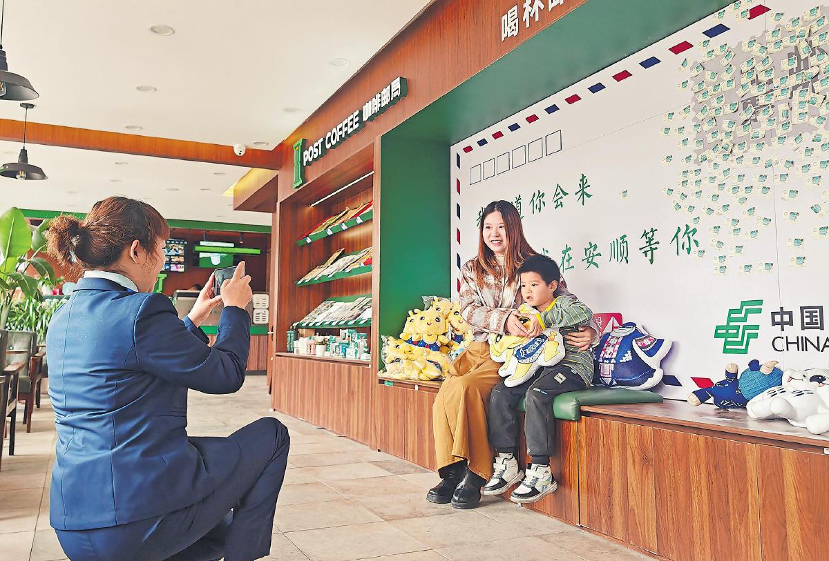 伴隨貴州省安順市打造城市旅游品牌的步伐,安順市郵政分公司深入推進文旅融合,與安順旅游集團文創(chuàng)商品發(fā)展有限公司攜手打造“郵局咖啡·遇見安旅店”。店內裝修兼具郵政特色、古城風格與現代風情,設有文創(chuàng)展示、郵局文化、網紅打卡、印章加蓋及DIY明信片等區(qū)域,為游客提供獨特文化體驗,成為安順古城旅游的新地標。圖為11月8日,郵政工作人員在為游客打卡拍照。