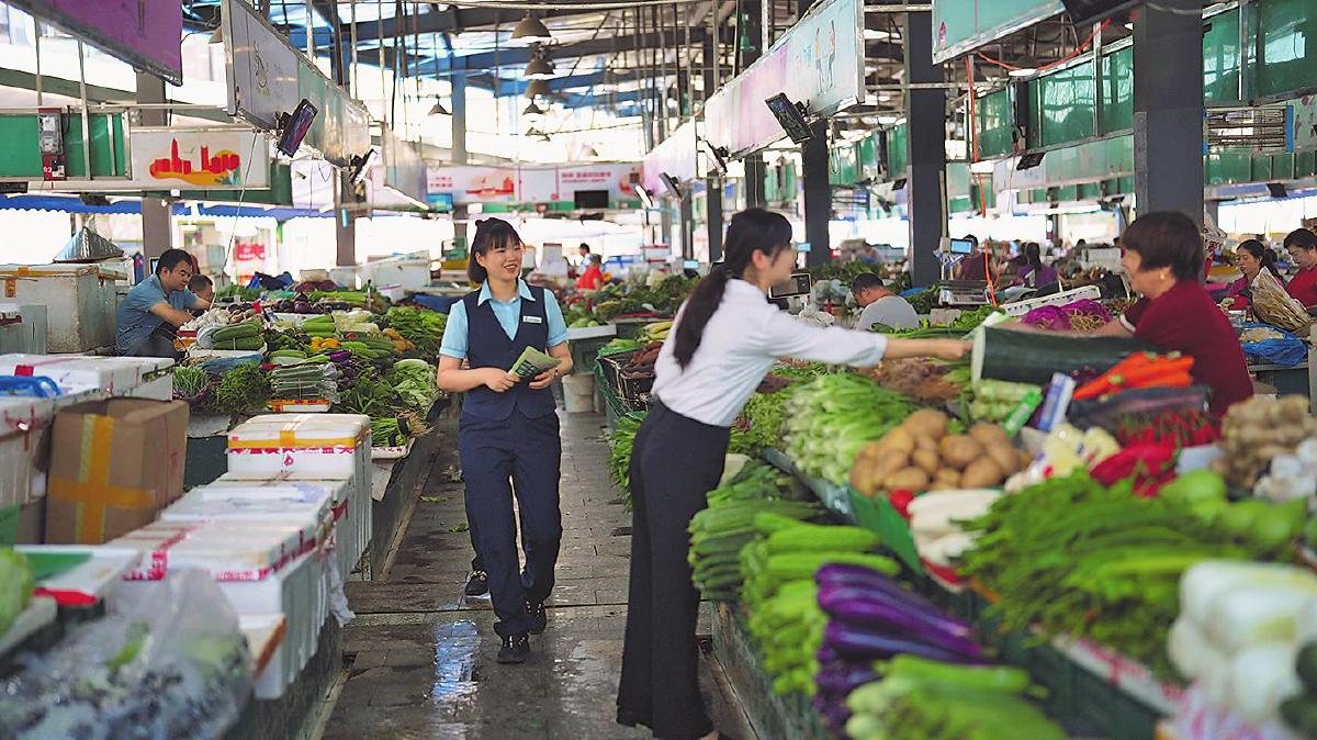 上午9點,陽光透過市場的棚頂,斑駁地灑落在濕漉漉的地面上,空氣中彌漫著新鮮蔬菜和水果的香氣。在廣東省深圳市龍華區觀瀾綜合菜市場,人潮開始涌動,一座城市剛剛醒來。深圳市龍華區郵政分公司的“郵金智聯隊”成員手持宣傳單,向菜攤逐個推介著。