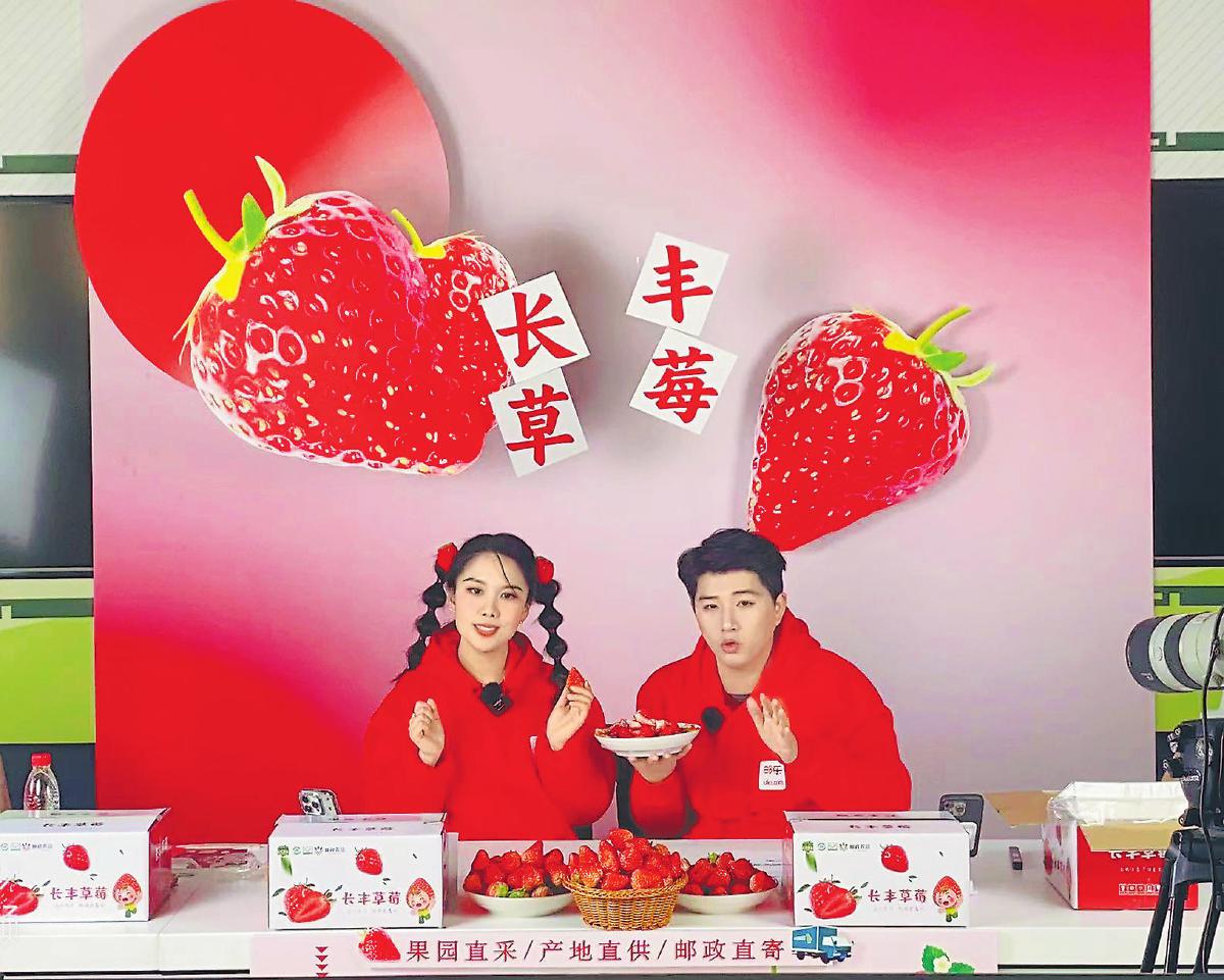 合肥郵政直播團隊開展溯源直播,為長豐草莓帶貨。□陳晶 攝